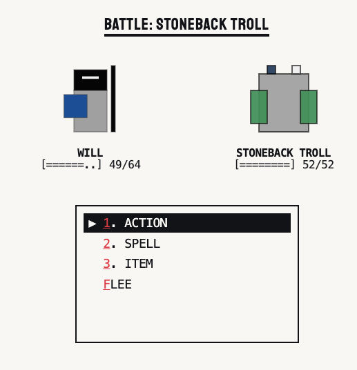 - Explore a Mondrian-inspired 2D grid, fighting monsters and gathering loot